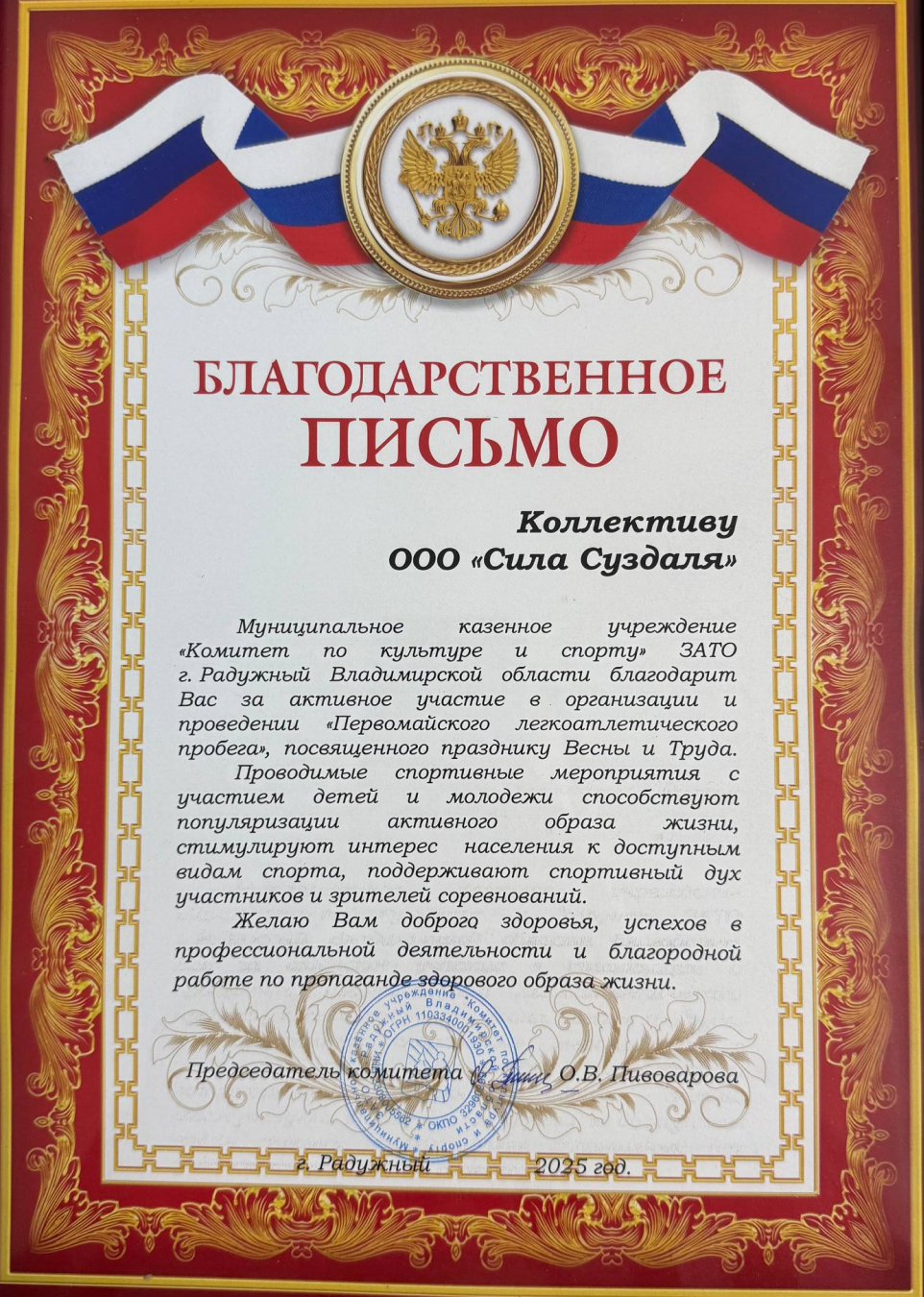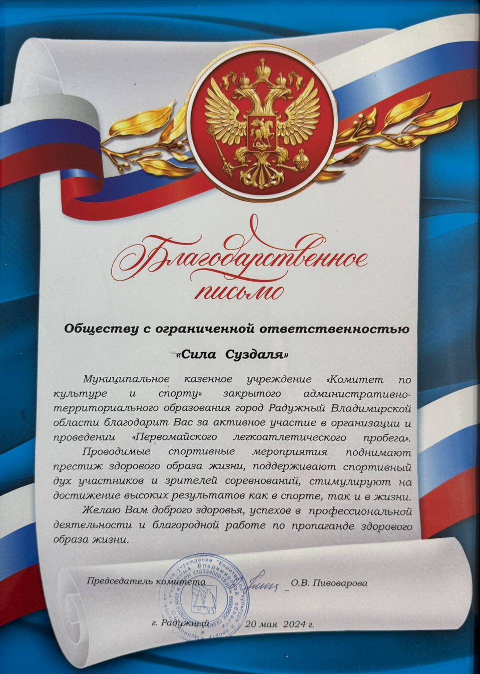 «Сила Суздаля» удостоена благодарственного письма за поддержку спортивных мероприятий и вклад в организацию Первомайского легкоатлетического пробега в Радужном Владимирской области. Мы способствуем развитию массового спорта и пропаганде здорового образа жизни!