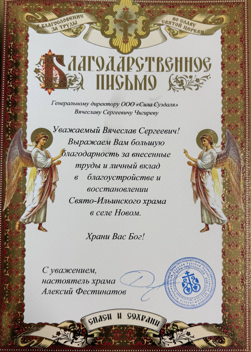 Генеральный директор «Сила Суздаля» Вячеслав Чигирев отмечен благодарственным письмом за помощь в благоустройстве и восстановлении Свято-Ильинского храма в селе Новом. Поддержка культурного и духовного наследия региона — важная часть нашей миссии.