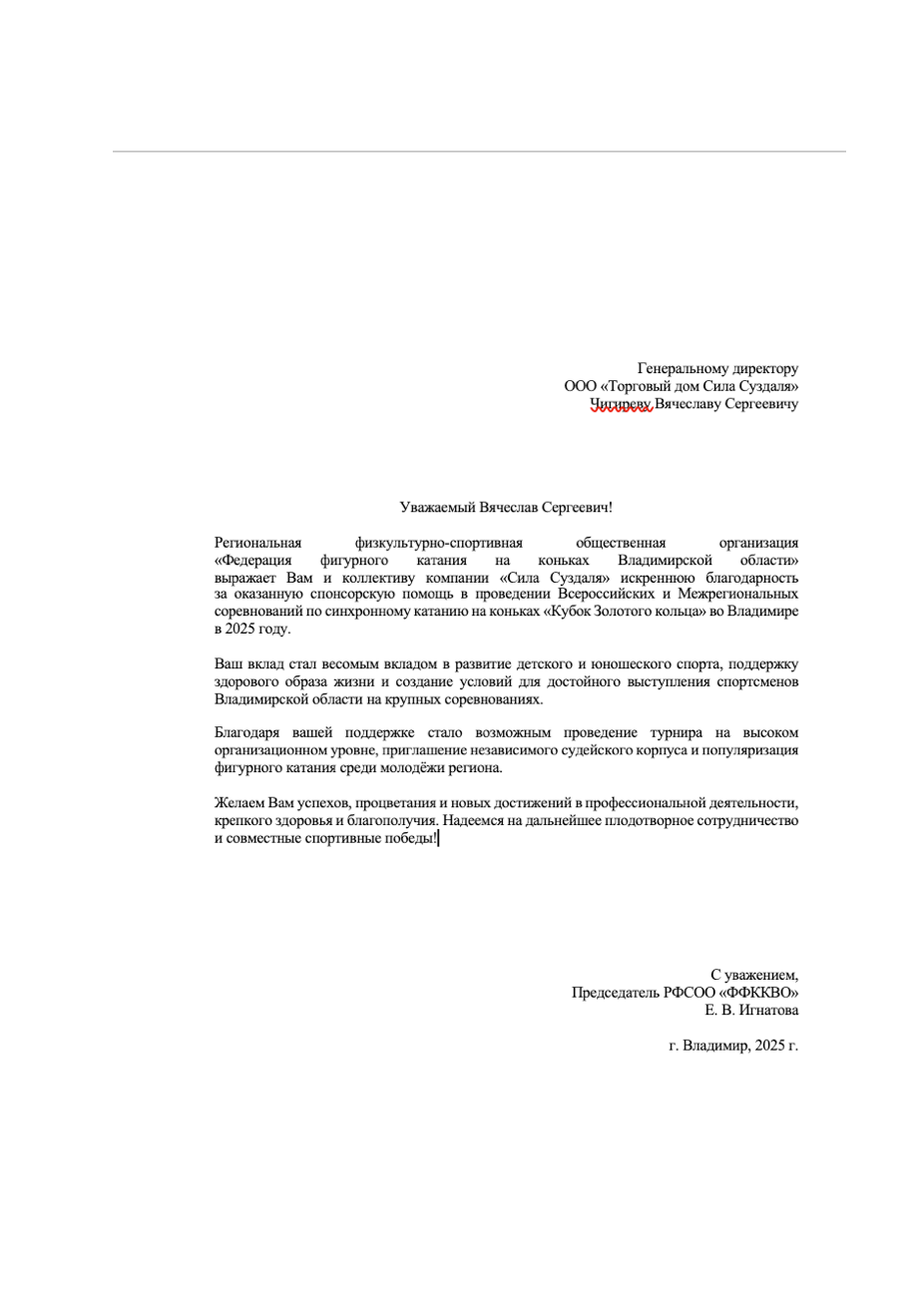 Благодарственное письмо за спонсорскую помощь Федерации фигурного катания