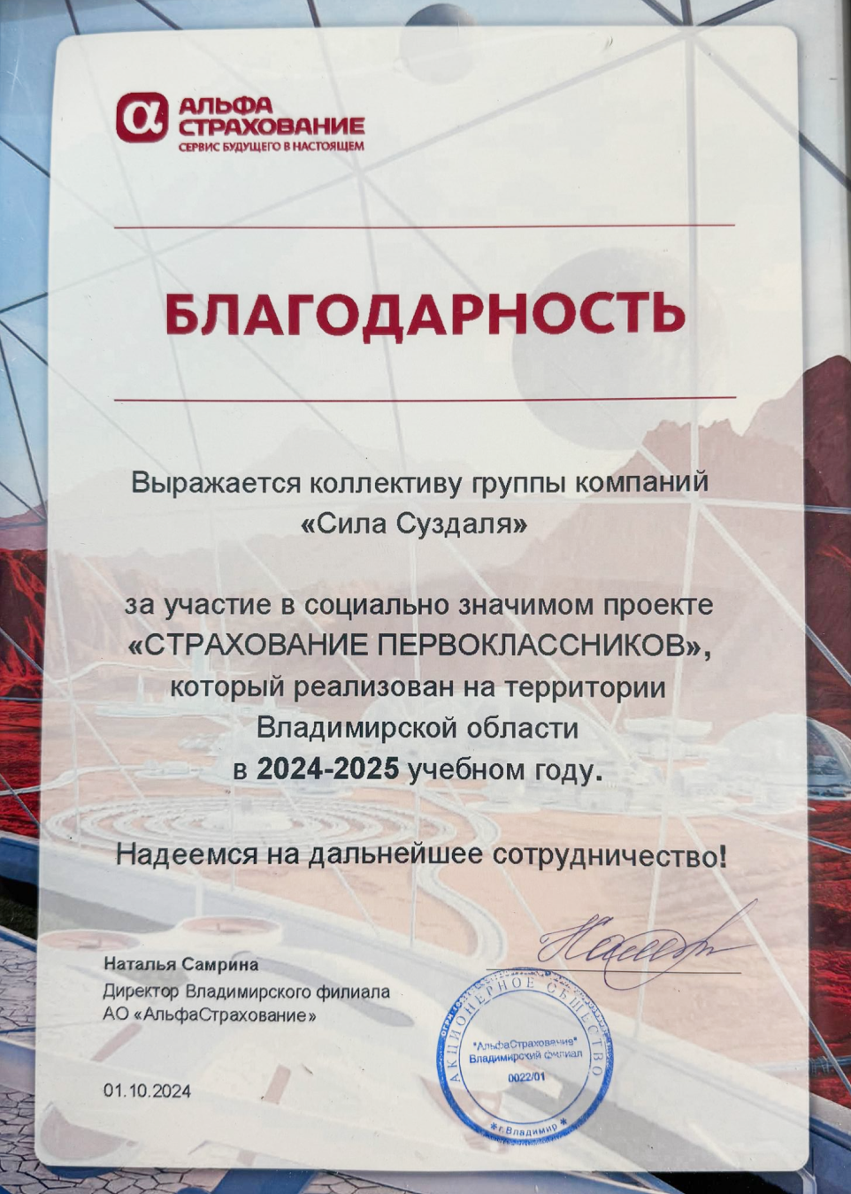 Группа компаний «Сила Суздаля» получила благодарность от «Альфа Страхование» за вклад в проект «Страхование первоклассников» во Владимирской области в 2024–2025 учебном году. Социальная ответственность, поддержка детей и забота о будущем региона!