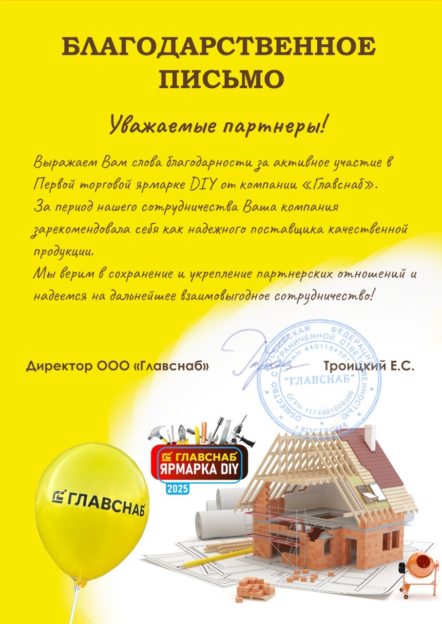 Благодарственное письмо за участие в ярмарке DIY и развитие партнёрства с «Главснаб»