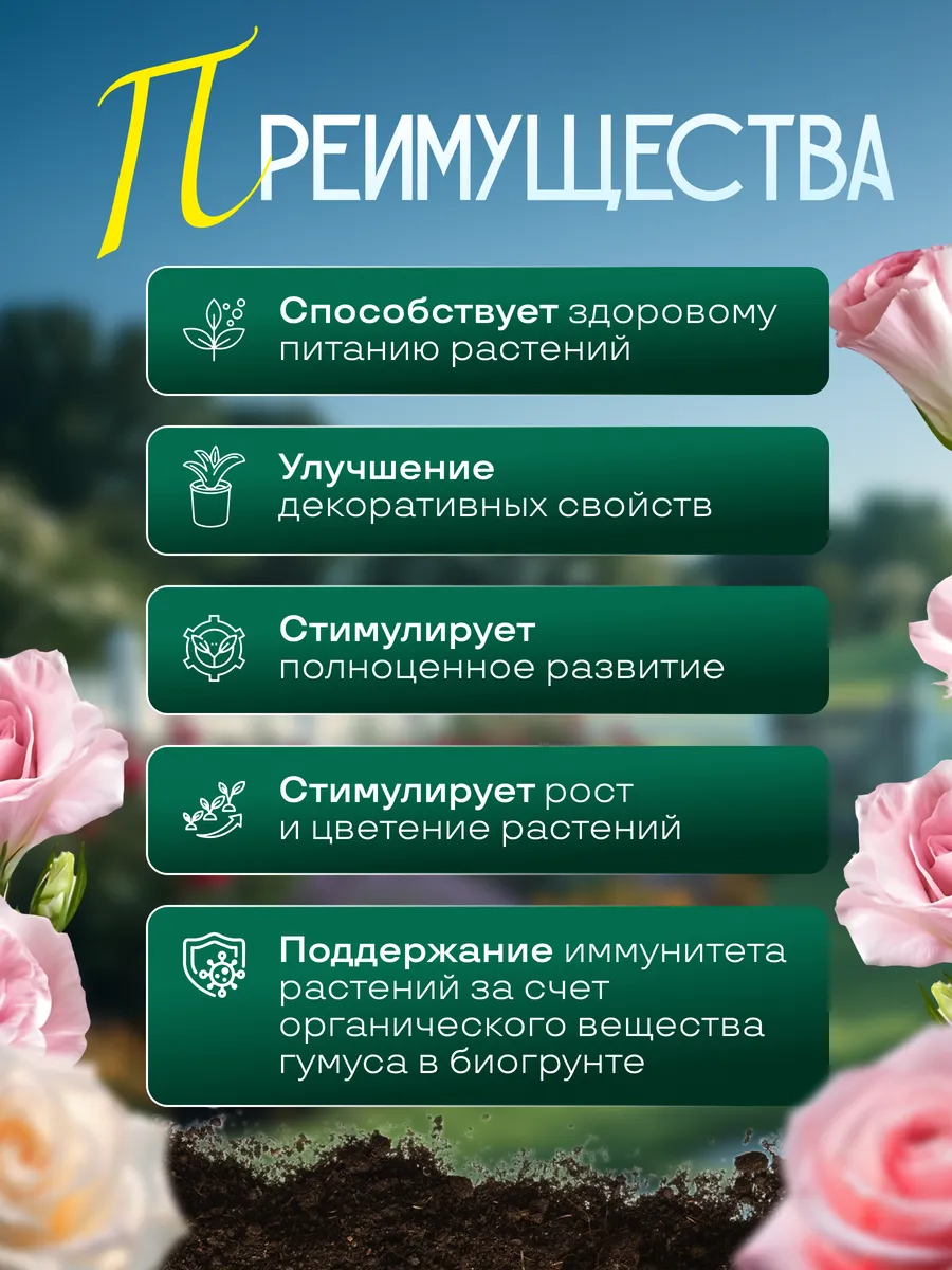 - Стимуляция роста и цветения: Макроэлементы (NPK) и гуминовые кислоты активизируют все жизненные процессы.