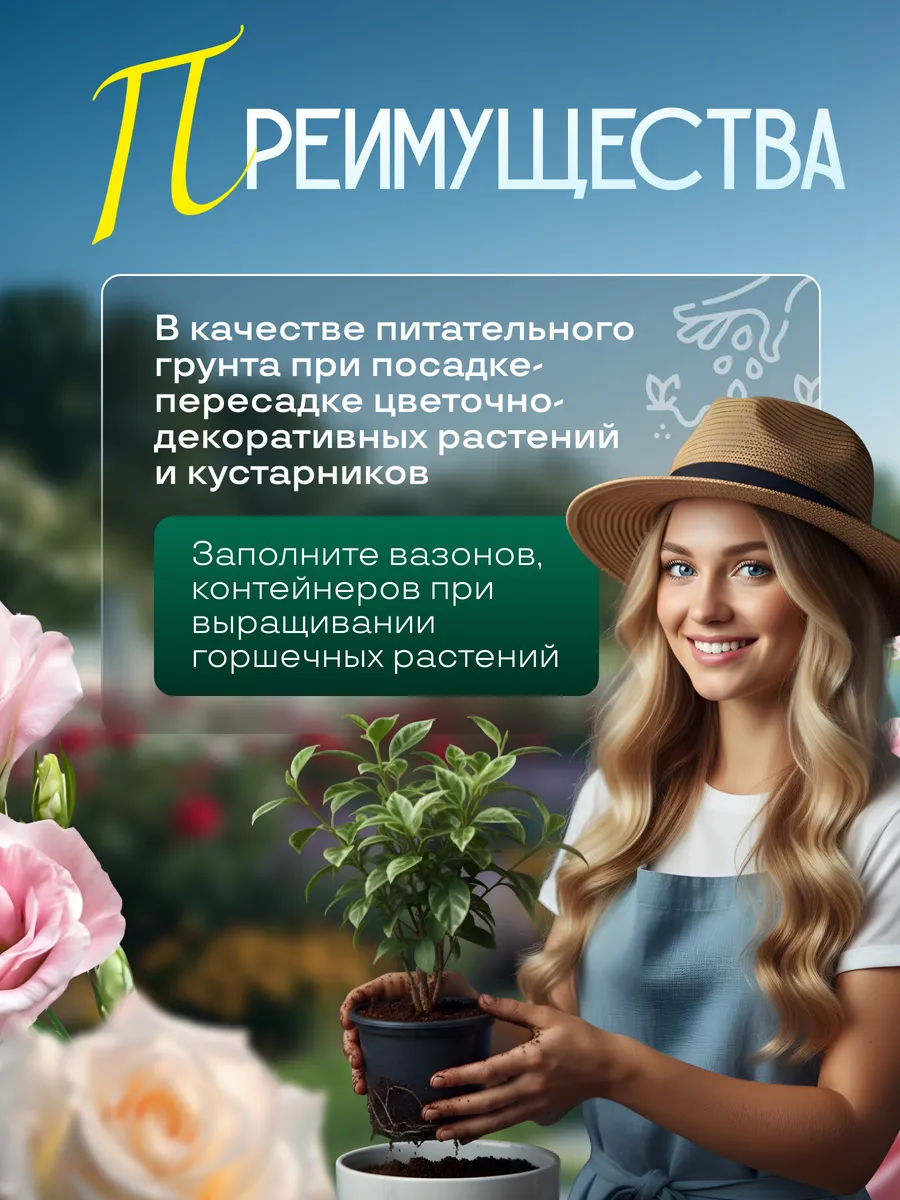 Грунт предназначен для широкого спектра садовых и комнатных работ: от посадки комнатного фикуса до разбивки масштабной клумбы с розами и многолетниками.