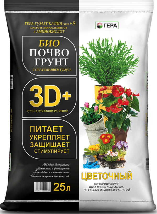 БИОпочвогрунт 3D+ с гумусом объемом 25 литров представляет собой оптимальный вариант для выращивания экологически чистой продукции и декоративных растений на больших площадях. Это полностью готовое удобрение обеспечивает растения всеми необходимыми элементами для здорового роста и развития как в открытом, так и защищенном грунте. Основой продукта является высококачественный профессиональный торф разной степени разложения, обогащенный специальными веществами: раскислителями, крупным термопеском и биологически активным препаратом Гера гумат калия, произведенным из экстрактов озёрного сапропеля.