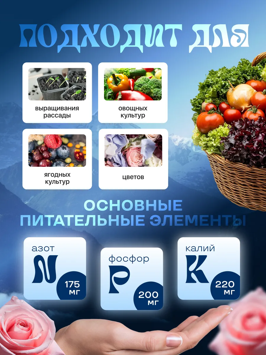 | Сбалансированный комплекс питательных веществ | Содержит полный набор макро- (NPK) и микроэлементов для здорового роста, цветения и плодоношения |