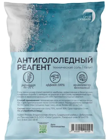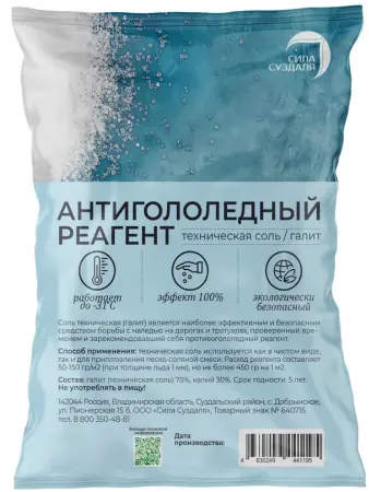 - Антигололедный реагент "Сила Суздаля" 20 кг — высокоэффективное средство для борьбы с гололедом на больших площадях.